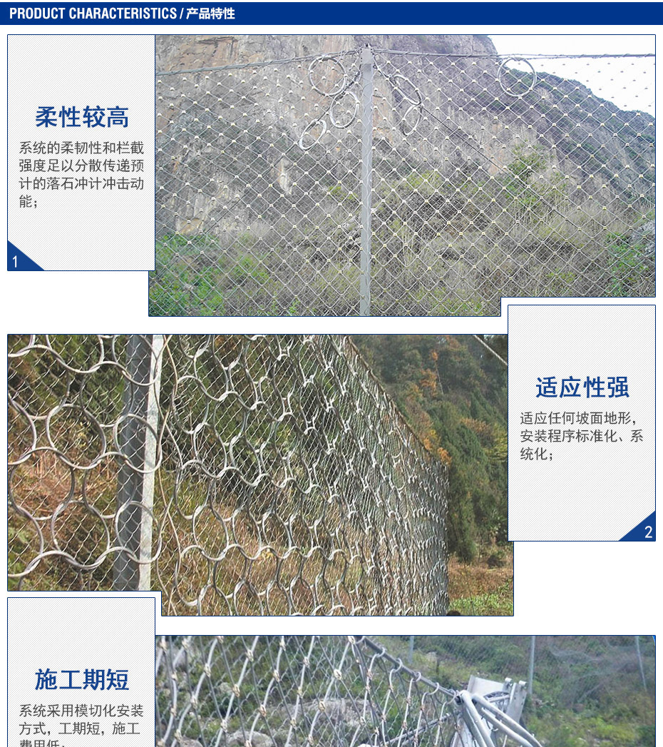 產(chǎn)品特性:系統(tǒng)的柔性和攔截強(qiáng)度足以吸收和分散傳遞預(yù)計(jì)的落石沖擊動能,消能環(huán)的設(shè)計(jì)和采用使系統(tǒng)的抗沖擊能力得到進(jìn)一步提高.與剛性攔截和砌漿擋墻相比較,改變了原有施工工藝,使工期和資金得到減少。