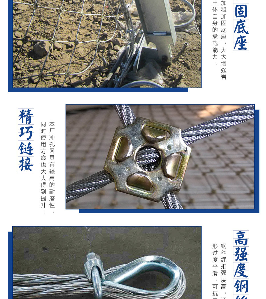由鋼絲繩網(wǎng)、環(huán)形網(wǎng)、(需攔截小塊落石時(shí)附加一層鐵絲格柵)、固定系統(tǒng)(錨桿、拉錨繩、基座和支撐繩)減壓環(huán)和鋼柱四個主要部分構(gòu)成。鋼柱和鋼絲繩網(wǎng)連接組合構(gòu)成一個整體,對所防護(hù)的區(qū)域形成面防護(hù),從而阻止崩塌巖石土體的下墜,起到邊坡防護(hù)作用。