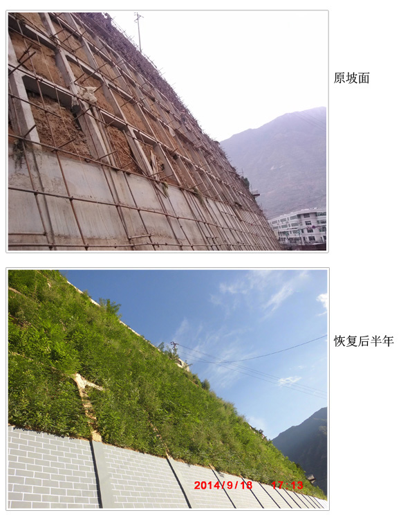客土噴播方法的選擇:根據(jù)當?shù)氐臍鉁兀涤炅浚卤取r石裂隙,巖石硬度,植物的選擇,以立地條件的不同來決定采用“金屬網(wǎng)鋪設工程+植被基材噴附工程”以增大生長發(fā)育基礎與坡體的連接性。選擇適合的草種配合比,改善綠色植物的生長發(fā)育環(huán)境和促進目標樹種生長的雙重功能,以確保噴射效果和質量。客土噴播材料中包括植物種子、有機營養(yǎng)土、土壤改良劑、穩(wěn)定劑、微生物菌劑、肥料等。客土噴播采用12m3空壓機和噴射機以及攪拌機等。