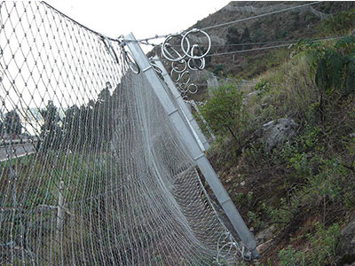 被動(dòng)邊坡防護(hù)網(wǎng)被動(dòng)保護(hù)系統(tǒng)由鋼絲網(wǎng)、高強(qiáng)鋼絲網(wǎng)、錨桿、工字鋼柱、上下錨索、消能環(huán)、底座、上下支撐繩等部件組成,該系統(tǒng)由鋼柱和鋼絲繩網(wǎng)組成一個(gè)全體,對(duì)保護(hù)區(qū)形成邊坡防護(hù),以防止崩塌巖石墜落,發(fā)揮邊坡防護(hù)效果。